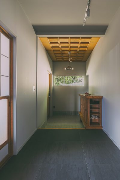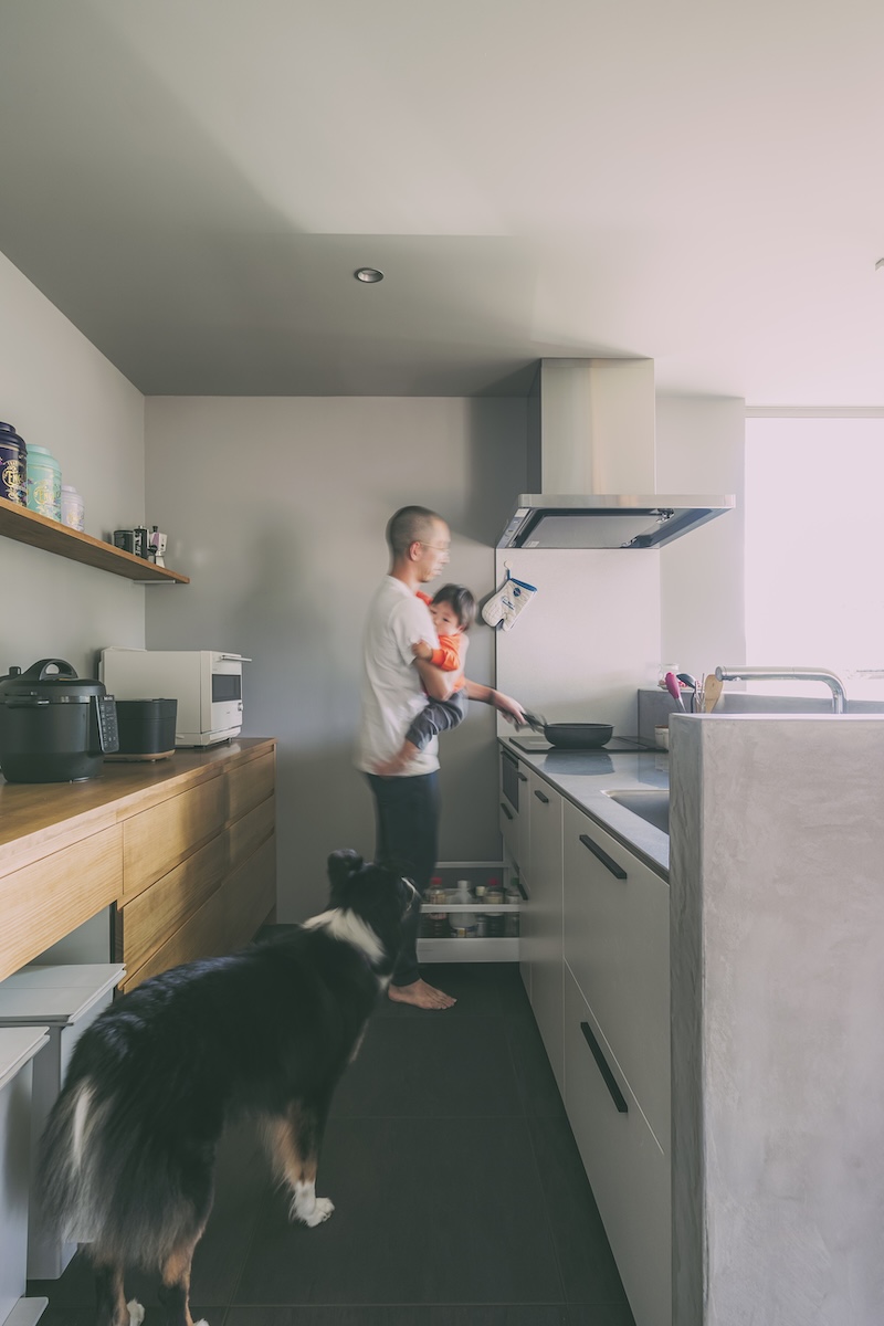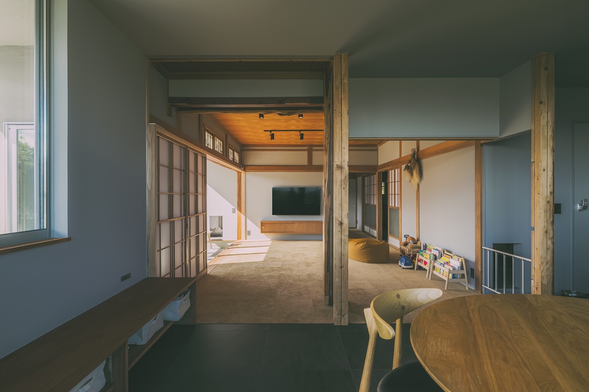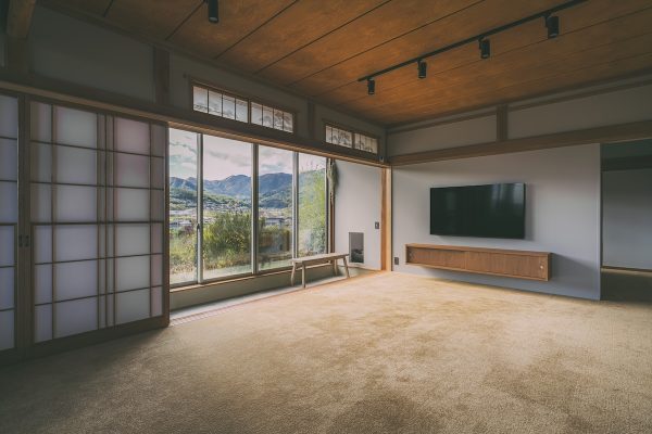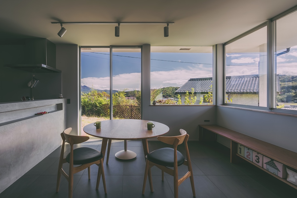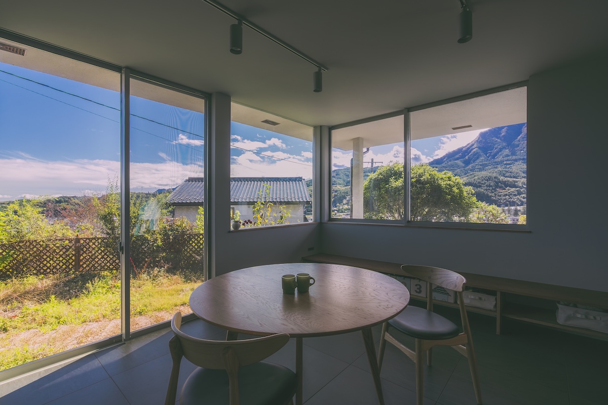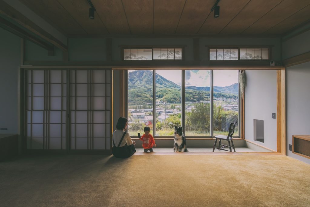 のどかな地域の高台に立つ、築37年の中古住宅をリノベーション。購入の決め手にもなった眺望の良さを生かし、景色を家の中に取り込んで広々暮らせる住まいに。愛犬が過ごしやすいよう、床はカーペットとタイル。広縁を改めた土間も格好の遊び場です。